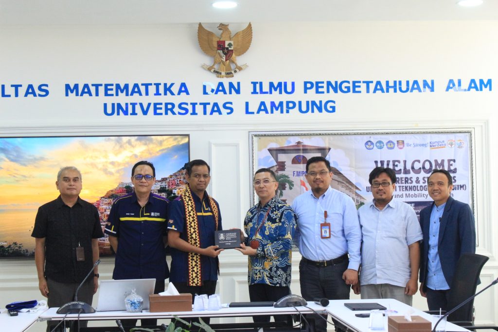 Pada hari ini Senin 26 Agustus 2024, Fakultas Matematika dan Ilmu Pengetahuan Alam (FMIPA) menerima kunjungan rombongan dari Universiti Teknologi MARA (UiTM), yang terdiri dari 22 orang (11 dosen dan 11 mahasiswa). Mereka akan mengikuti program outbound UiTM mulai dari 26 Agustus hingga 9 September 2024. Program ini mencakup kegiatan sharing topik penelitian antara dosen dan mahasiswa, kelas sit-in, workshop, pertukaran budaya, serta program pengabdian masyarakat STEM di sekolah. Tiga sekolah di Bandar Lampung, yakni SMA Al-Kautsar, SMKN 2, dan SMA YP UNILA, akan menjadi sekolah satelit untuk program pengabdian tersebut. Dekan FMIPA UNILA, Dr. Eng. Heri Satria, M.Si., menyambut rombongan di Ruang Sidang Dekanat Lantai 2 FMIPA. Dalam sambutannya, beliau tidak hanya menyambut baik program ini, tetapi juga menegaskan bahwa perluasan MoU antara UNILA dan UiTM di FMIPA akan semakin memperkuat kerjasama kedua universitas..
